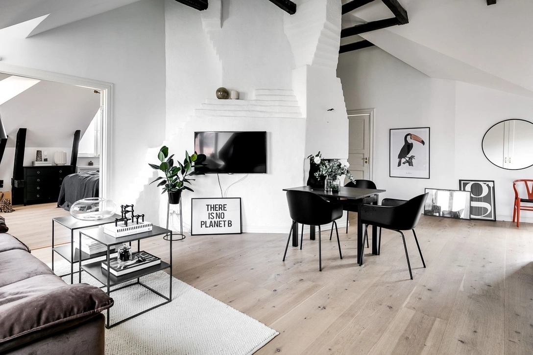 Квартира площадью 81 кв. м, в котором Марго живет вместе со своим другом Джейкобом и их маленьким сыном Арнольдом, расположена на чердачном этаже под самой крышей типичного старого стокгольмского дома — с деревянными перекрытиями, высокими ломанными потолками, красивыми оконными проемами и настоящей дровяной печью-«буржуйкой»!