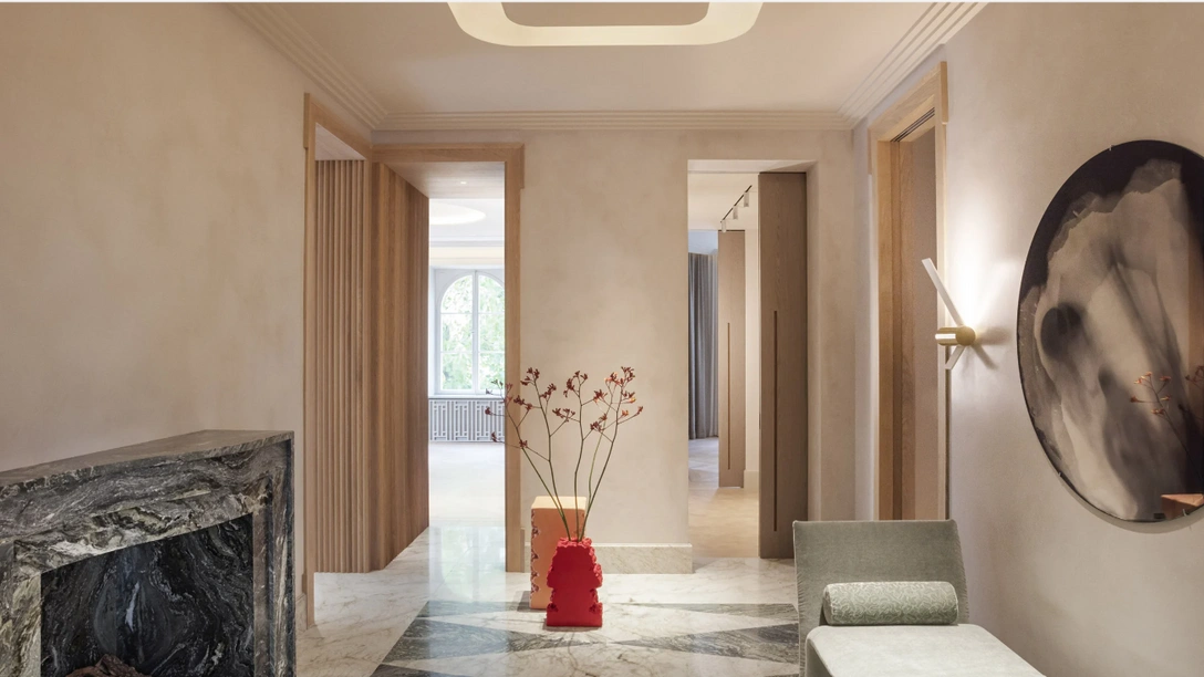 «Для улучшения акустики нам пришлось снять все полы, чтобы укрепить балки и уложить 100 тонн мраморного щебня. Затем мы залили новый пол во всей квартире, чтобы настелить новые деревянные и мраморные полы. Для потолков нам пришлось создавать подвесные конструкции, отделенные от первоначальных плит перекрытия», — вспоминает архитекор Йеспер Меллгрен»».