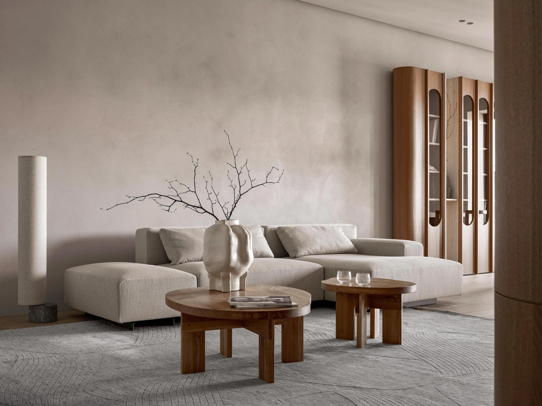 Дизайнеры сделали ставку на природные фактуры, главную роль отдали дубу яркого, почти коньячного оттенка, которые ненавязчиво отсылает к эпохе 1970-х. Дерево дополняет серо-бежевая штукатурка с бархатистой текстурой на стенах и травертин, которым оформлены оконные проемы.