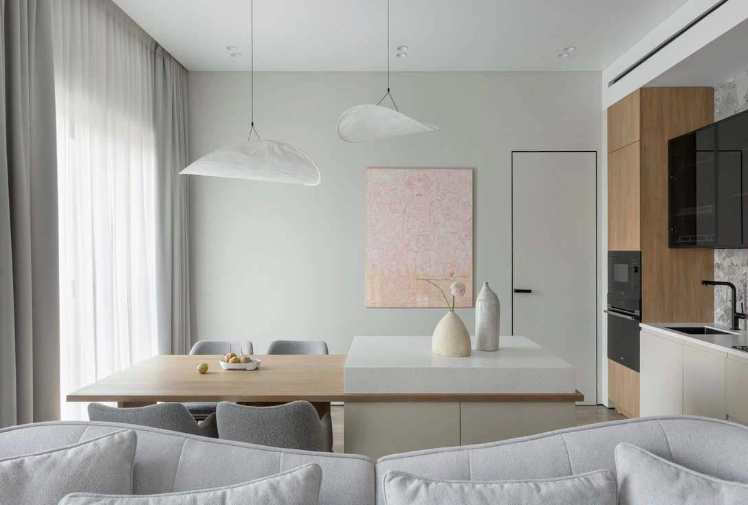 Проект на первый взгляд, простой, но продуманный до мелочей. Заходя в квартиру, мы сразу оказываемся в просторной кухне-гостиной. Она делит все пространство на две части — мастер-блок и гостевую зону. Нетипичным образом организована кухня: рабочая поверхность размещается в нише, а остров расположен перпендикулярно ей, а не как обычно принято — параллельно. В острове спрятаны дополнительные ящики для хранения и винный шкаф.