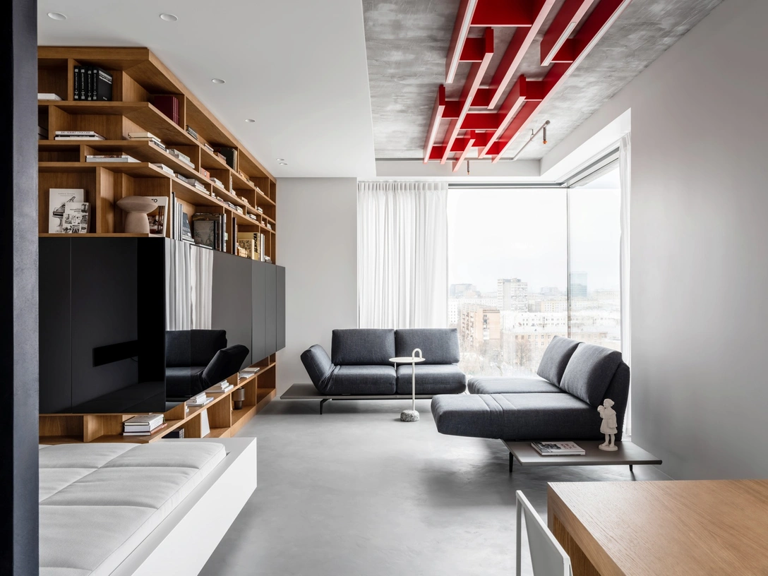 Принципы супрематизма нашли воплощение в геометрии объемов, их пересечении и наслоении, а также в противостоянии спокойной и сдержанной фоновой палитры и открытых активных акцентов в мебели и произведениях искусства. В центре квартиры расположен параллелепипед, вокруг которого выстроено круговое движение. Это единый цветовой блок, где пол, стены и потолок выполнены из одного материала. Внутри устроены системы хранения и хозяйственные помещения, снаружи — жилые пространства.