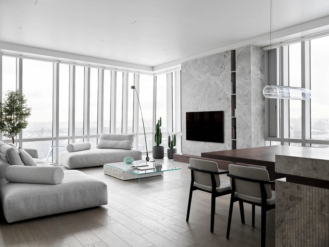 Основная идея проекта: создать минималистский «прозрачный» интерьер, главным героем которого является вид на Москву