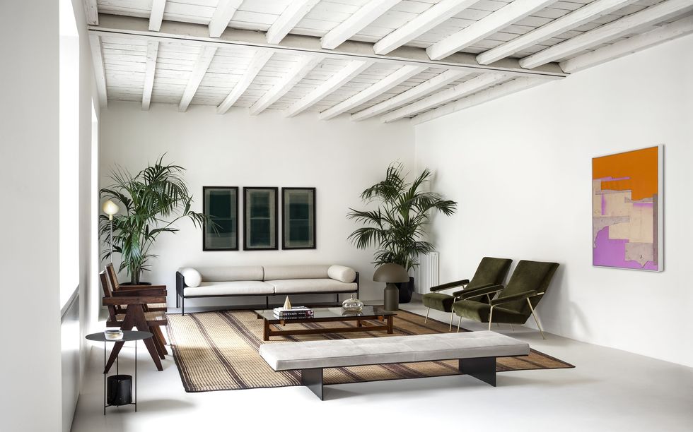 Лаконичная кухня без верхних модулей напоминает большой буфет, тянущийся от одной конца стены до другого. Рядом со столом Tulip, окруженным деревянными стульями с кожаной обивкой, располагается дополнительный шкаф для хранения посуды и необходимых мелочей. В гостиной черно-белую гамму разбавляют яркие абстракции на стенах и живая зелень. Кресла Джо Понти (Gio Ponti) и Шарлотты Перриан (Charlotte Perriand) сочетаются с более минималистичными предметами, такими как лампа Atollo, создавая сложный баланс между строгостью и выразительностью.