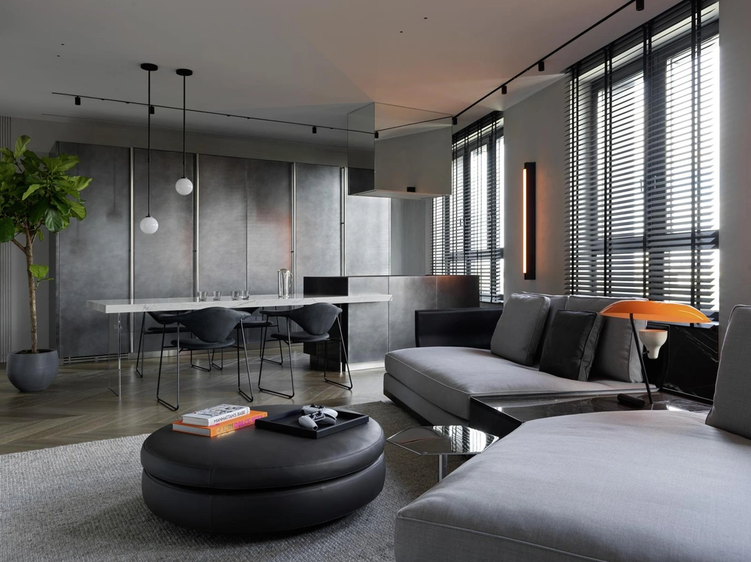По признанию дизайнеров студии Galerie 46, самым важным в этом проекте было продумать планировку, идеально подходящую заказчикам —молодой семье, которая любит принимать гостей. У трехкомнатной квартиры площадью 100 кв. метров в новом доме была пара существенных недостатков: во-первых, глухой темный коридор, во-вторых, острые углы в пространствах неправильной формы, которые осложняли дело. Впрочем, расположение на берегу Москвы-реки и виды на город, открывающиеся из больших окон, перевешивали минусы.
