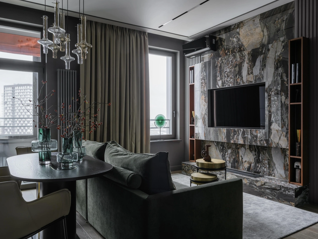 «Интерьер выполнен в темных природных тонах. Самым сложным оказалось подобрать зеленый оттенок для стены в гостиной, чтобы он сливался с эмалью на двери. Поскольку материалы разные, цвет тоже воспринимался по-разному, поэтому нам пришлось сделать 19 выкрасов, чтобы попасть в нужный».