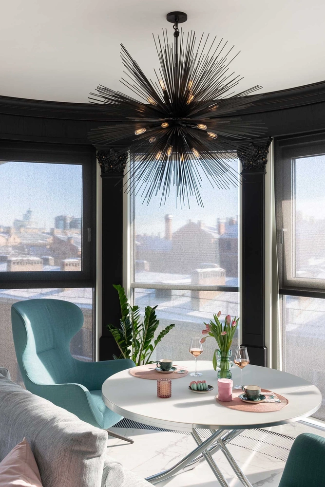 Компактная кухня с матовыми черными фасадами, созданная по эскизам дизайнера, обладает всем необходимым и по функциональности ничем не уступает более просторным образцам. А конструкция стола-трансформера в эркере позволяет регулировать его высоту и длину — так он может быть адаптирован для разных компаний во время визита гостей.