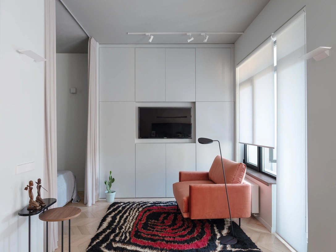 Площадь квартиры небольшая (40 кв.м.), поэтому мы решили не дробить пространство на части. Открывая входную дверь, мы оказываемся в прихожей, откуда просматривается практически вся квартира: справа находится кухня с островом, слева — гостиная. Легкие шторы в цвет стен обозначают переход из гостиной в спальню. Межкомнатная дверь в квартире только одна — за ней скрывается ванная.