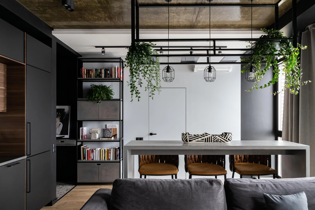 «В проекте довольно много уникальных предметов или решений. Например, гардеробную закрывает перегородка, выполненная из строительной сетки. Над барной стойкой расположилась металлическая конструкция, которую мы дополнили живыми растениями, а кухню украсил стальной фартук с рисунком морской ряби. За ним, кстати, по словам хозяев, не так сложно ухаживать».