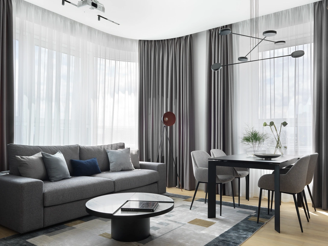 «Заказчики проекта, молодая пара, интересуются культурами других стран и народов и постоянно путешествуют. Они хотели, чтобы их новая квартира стала местом, куда хочется возвращаться даже из самых увлекательных поездок, — рассказывают дизайнеры Анастасия Ковальчук и Мария Двадцатова. — Интерьер получился очень выдержанным и архитектурным. Основная концепция построена на простоте и легкости линий, которые перетекают одна в другую, делая пространство объемнее. Стены играют роль фонового холста, на котором четче просматривается геометричность помещения».