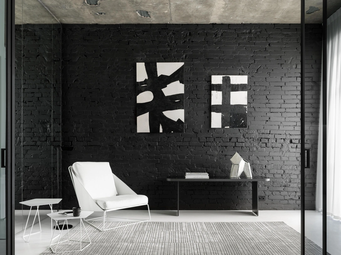 В оформлении квартиры дизайнеры использовали минимум отделочных материалов: кирпичные стены просто покрыли краской, чтобы был виден рисунок кладки, а бетонный потолок и вовсе решили оставить открытым. Сложная фактура бетона смотрится особенно эффектно в сочетании с матовым белым покрытием пола. За основу цветовой палитры интерьера дизайнеры выбирали серые оттенки, которые «смягчают» брутальность материалов.