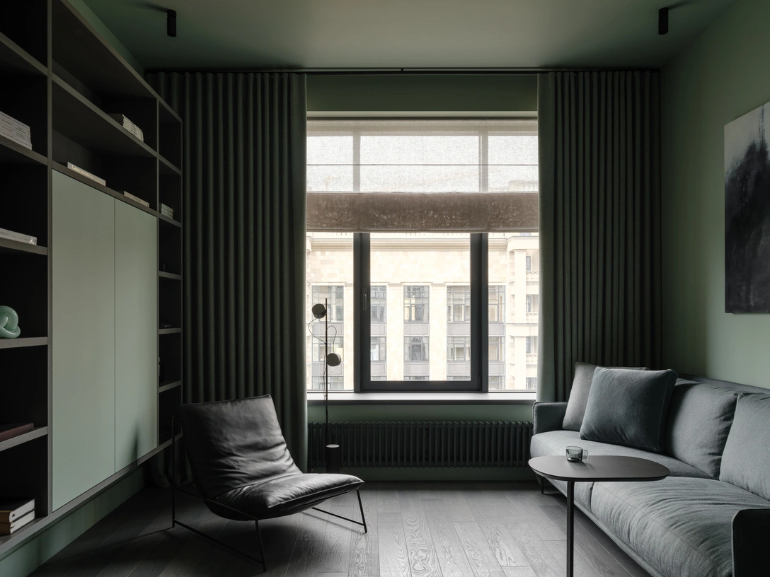 «Цветовая палитра квартиры слово обнимает своих обитателей и дает мыслям прийти в состояние покоя и баланса. Стены и потолок во всех комнатах выполнены в нежном серовато-зеленом цвете, а на полу лежит массивная доска холодного серого оттенка. Гостевой санузел решили сделать „густым“ и насыщенным. Цвет стен и плитки здесь глубокого зеленого оттенка. Комната напоминает малахитовую шкатулку. Графичности интерьеру придают черные акценты в виде светильников, аксессуаров и дверных ручек».