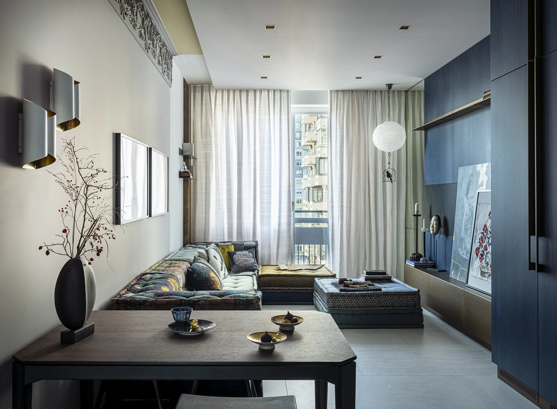 Отправной точкой проекта стал диван Mah Jong от Roche Bobois, который разработал дизайнер Кензо Такада (Kenzo Takada). Яркая модель навеяна эстетикой традиционного японского театра Но. Так все принты и текстуры в интерьере отсылают к иконографическим орнаментам театральных костюмов: треугольники — это мотив чешуи дракона, шестигранники — узор панциря черепахи, цвета разных времен года — излюбленный мотив японского искусства.