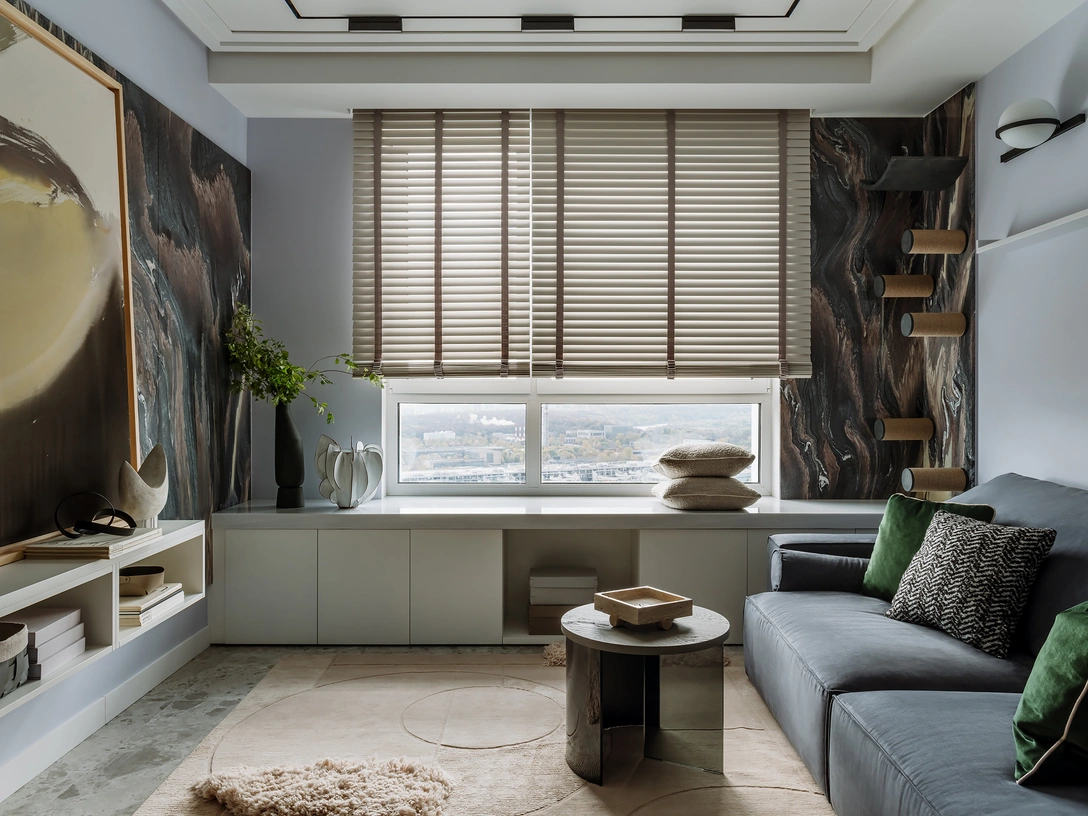 «Еще одним необычным элементом интерьера стал игровой комплекс для кота. Его удалось вписать в интерьер гостиной достаточно гармонично. Если не знать, что в доме есть кот, то можно подумать, что это просто настенный декор. Также у заказчиков живет еж. Чтобы встроить его клетку в нишу под окном, мы несколько раз меняли размеры подоконной тумбы».
