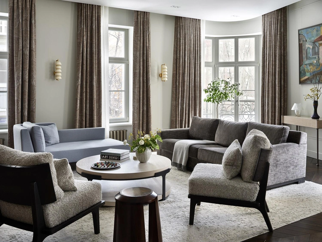 Важную роль в интерьере гостиной играет текстильное оформление. Французские окна, из которых открывается вид на уютные улочки старой Москвы, украшают шторы с принтами, отсылающими к убранству комнат приема королевы Виктории. Из гостиной можно попасть в два кабинета — мужской и женский, в каждом из которых есть собственный характер и домашняя библиотека, подобранная командой нашего арт-отдела с учетом вкусов заказчиков.