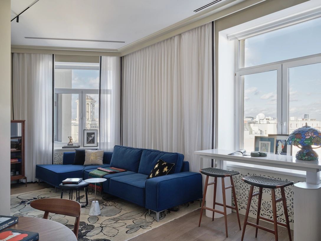 Сердцем квартиры стала кухня-гостиная. Дизайнеру Анастасии Ильиной удалось создать комфортное пространство для встречи с друзьями, завтрака на бегу или неспешного романтического ужина. Центральное место в гостиной занял синий диван, который при необходимости превращается в полноценное спальное место. В зоне кухни располагается полноценная столовая группа. Зеркальное оформление кухонной стены расширяет границы пространства и создает дополнительную глубину. Барная стойка быстро и эффектно трансформируется в продолжение большого подоконника с прекрасным панорамным видом на всю историческую часть Москвы.