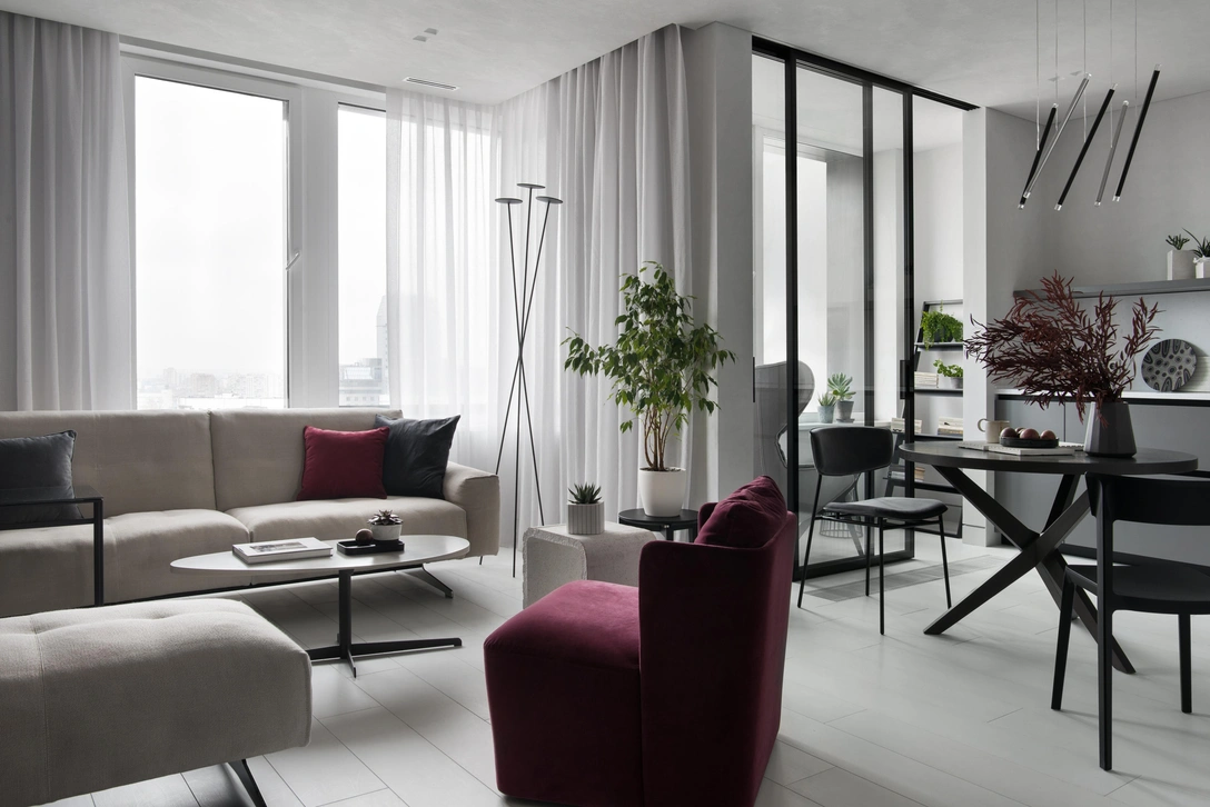 «Отправной точкой проекта стала большая фотография, которую хозяйка сделала во время своего путешествия по Исландии. Изначально фото, расположившееся в гостиной, было наполнено багряными оттенками заката — отсюда в интерьере появилось бордовое кресло и текстиль. Тем не менее, заказчица решила, что красок заката над Москвой в квартире будет достаточно, поэтому фотографию сделали черно-белой. Благодаря графической прорисовке, пейзаж выглядит так, будто его нарисовали карандашом».