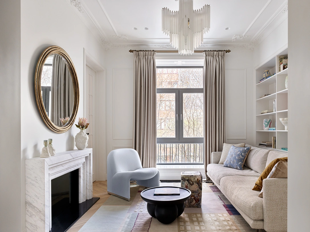 «Из прихожей мы сразу попадаем в небольшую, но уютную гостиную. Особую атмосферу здесь создает декоративный камин из натурального белого мрамора и большой книжный стеллаж. Заказчица много читает, и нам хотелось создать романтическую обстановку, настраивающую на спокойный вечер с книгой в руках».