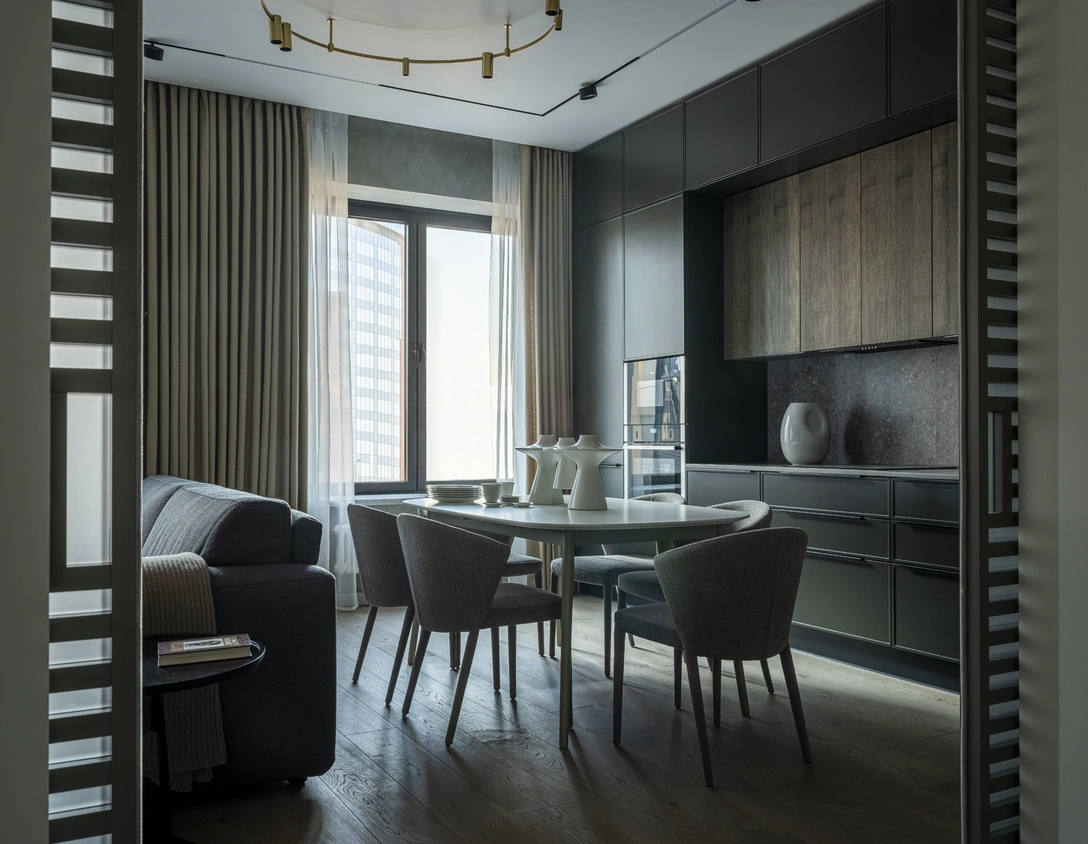 Эта максимально функциональная московская квартира принадлежит молодой девушке из Санкт-Петербурга, которая живет на два города. Ее дом в северной столице оформлен совершенно в другом стиле, а для жизни в Москве она попросила создать пространство, где не будет ничего лишнего — для полного расслабления и отдыха. Поэтому дизайнер Мария Трофимова решила использовать мягкую, темную палитру, которая бы успокаивающе действовала на хозяйку, когда та приходит домов после сложного рабочего дня.