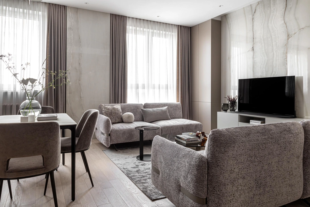 Заказчики, супружеская пара, попросили создать современный интерьер в нейтральной серо-бежевой гамме. Хотелось, чтобы дизайн квартиры как можно дольше оставался актуальным, особое внимание нужно было уделить качеству используемых материалов и сделать акцент на сочетании разных фактур.