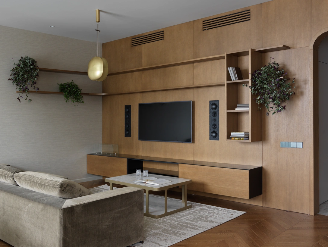 Панели, часть кухонного гарнитура, двери, порталы и обрамление ниши в спальне выполнены из дуба. Керамогранит из холла перетекает в кухонную зону и «поднимается» на стену. Природную тему продолжают полки в гостиной, на которых разместились вьющиеся растения. «Камин также пришелся кстати, — добавляют дизайнеры, — нам представлялось, что при отблесках пламени здесь будет приятно слушать музыку после тяжелого рабочего дня».
