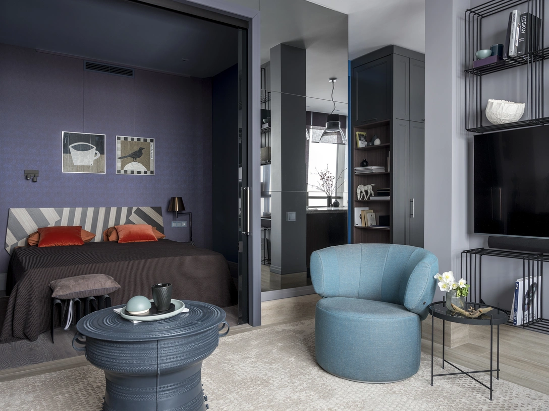 «Важным пожеланием была продуманная система хранения, в частности при спальне. Мини-гардеробная скрыта за тканевой панелью и дверью-невидимкой, тоже обитой тканью. Цвет стен и потолка спальни подбирался на основе ткани Nobilis, которая использована для обивки перегородки. Одинаковый цвет стен и потолка позволяет стереть границы пространства. Мы скорее подумаем, что помещение довольно большое, чем маленькое. Темно-синий цвет спальной зоны, которая превращается в комнату, когда задвигаются стеклянные панели, делает ее похожей на кокон или бархатную коробочку. Человеку во время отдыха необходимо чувство защищенности!»