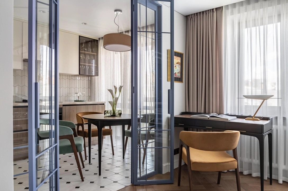 Первым делом мы сделали перепланировку — объединили санузел, увеличив его за счет коридора, а пространство кухни-гостиной разделили стеклянной перегородкой. Также мы убрали подоконные блоки, расширив фасадное остекление. Все это мы, естественно, согласовали в Мосжилиспекции. Перепланировка позволила разместить много мест хранения — встроенная мебель не загромождает пространство.