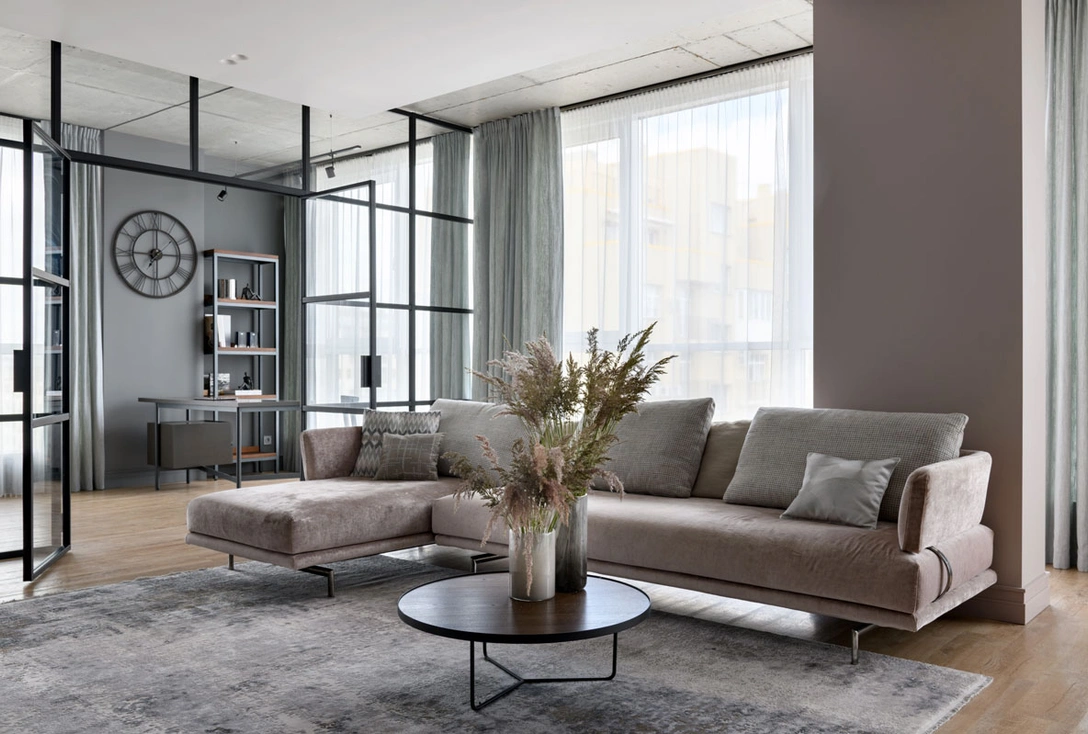 Два главных оттенка в палитре — металлический серый и пыльный розовый, который выгодно оттеняют геометричные черные линии. «Основным руководителем действий выступала заказчица, наверное, именно поэтому цветовая гамма всего интерьера светлая и немного женственная. Но, конечно же, есть в ней и мужское начало. Это заметно невооруженным взглядом в строгости линий и брутальность некоторых элементов».