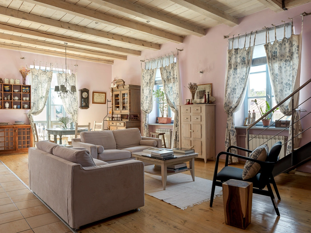 Когда из-под штукатурки и дранки обнажились балки межэтажных перекрытий, стало понятно, что этот цвет смотрится слишком просто. Поэтому я затонировала их белым маслом — делать это пришлось в несколько слоев, что заняло больше времени. Но результат превзошел ожидания. Дерево на полу — простая сосновая доска, стандартная, но широкая и тоже покрытая белым маслом.