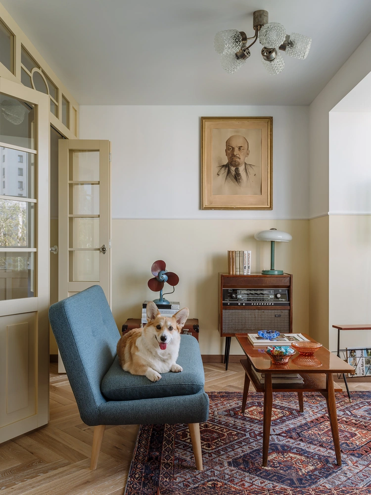 «Со стилем я определился сразу, едва увидел объект, — советский минимализм. Тихий зеленый двор, блочный дом 1965 года, завораживающий вид на „высотку“ на Котельнической набережной — никакого другого стиля тут быть не могло. Для многих советский стиль — это нарядный сталинский ампир, но ведь ему на смену пришел именно минимализм 1960-х, в комнатах заняла место лаконичная мебель небольших размеров, — чтобы вписалась в такие малогабаритные квартиры, как эта».