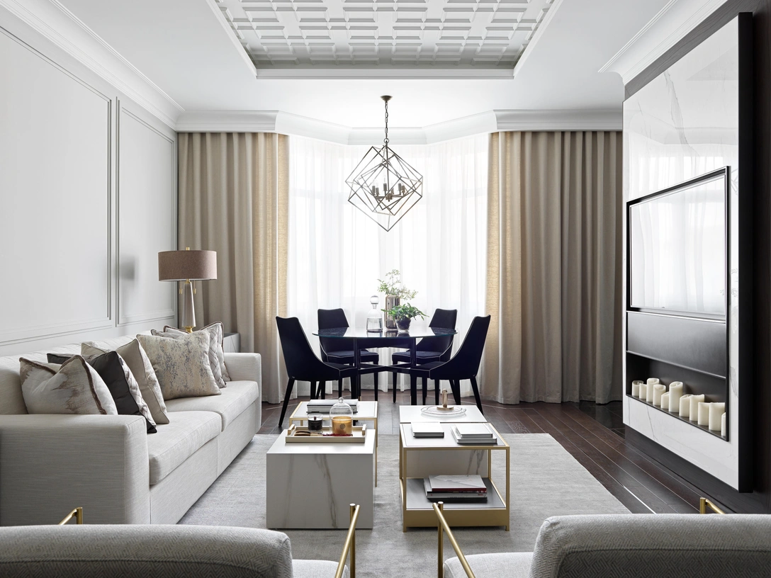Основное внимание дизайнер уделила лепному гипсовому декору. Концепция интерьера подразумевает единый цвет и материал молдингов, отделки порталов и проемов. Все декоративные элементы выполнены из гипса, и каждый был разработан специально для этого проекта. Еще одна особенность интерьера — подсветка в полу. Она подчеркивает архитектуру порталов и фактуру дерева шпонированных панелей.