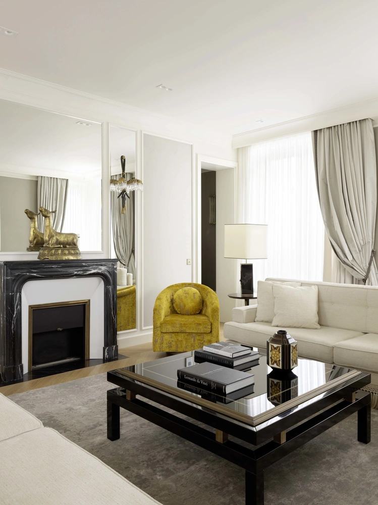 Многие решения продиктовала современная архитектура дома. Это ванная с красивым видом из окон, просторный холл, спальня с отдельной гардеробной и, конечно, гостиная с выходом на террасу и укромным помещением для бара. Специально для гостиной Лейла спроектировала кресла в обивке из желтого фактурного бархата. «Он привнес в комнату звонкий цвет, при этом прекрасно работает с элементами из латуни и золота, которые присутствуют в люстре, декоративных панно и расписных вазах».