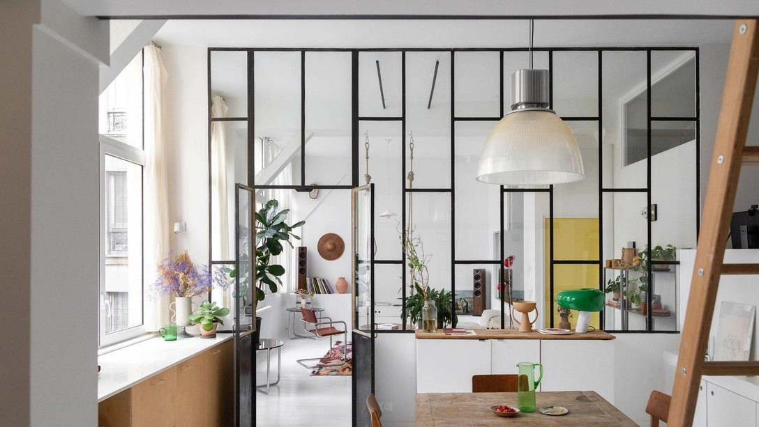 Большая часть площади отведена под гостиную и кухню-столовую. Две комнаты, разделенные стеклянной перегородкой со стальным каркасом, одним из немногих сохранившихся элементов бывшей швейной мастерской, воспринимаются как одна.