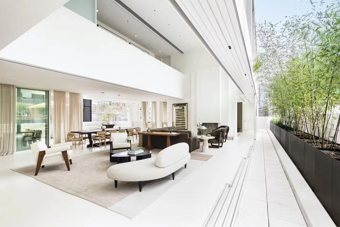 В мезонине находится похожая на спа-салон приватная зона с собственной террасой и ванной, откуда видна гостиная на первом этаже. Из окон открывается бесподобная панорама города с видом на Хадсон-Ярдс и Эмпайр-стейт-билдинг. К этой зоне примыкают две комнаты, которые можно использовать по-разному: это может быть и гардеробная, и тренажерный зал, и офис. Расположение двух дополнительных спален напротив приватной зоны обеспечивает уединение для хозяев и их гостей.