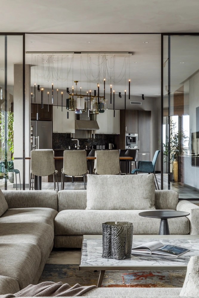 «Планировка на первый взгляд может показаться запутанной, но по факту все просто и логично. По центру квартиры расположена большая гостиная с двумя функциональными зонами и отделенная от нее раздвижной перегородкой кухня-столовая с выходом на террасы. В левой части квартиры расположены детские комнаты, в правой — спальня родителей и гостевая комната. Еще одной важной задачей было разграничить общественную и приватную зоны и спроектировать большое количество подсобных помещений».