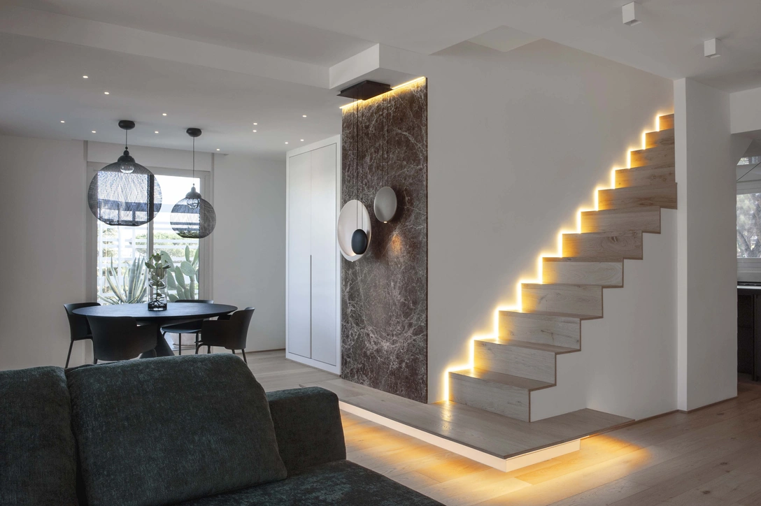 Главной «героиней» нижнего этажа стала лестница, словно парящая в воздухе благодаря подсветке и отсутствию перил. Общую гамму после обсуждения с хозяевами решили оставить нейтральной, без ярких красок. Правда, не обошлось без эффектных акцентов: в гостиной это стена, отделанная мрамором — своеобразный «противовес» воздушной конструкции лестницы. Еще один центр притяжения — это мягкая группа, которую образуют диван диван Absolu и кресло в форме распускающегося цветка Getsuen от Edra.