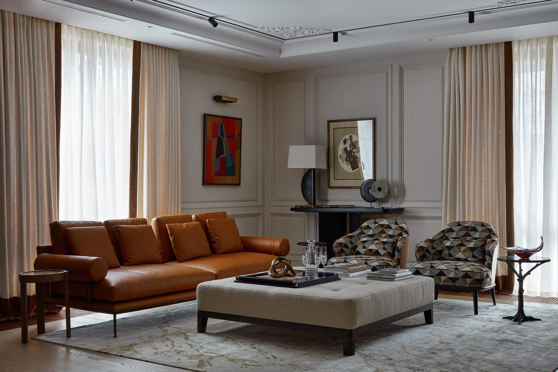 Отправной точкой проекта стала просторная гостиная, особый шарм которой придает сочетание стеновых панелей из ореха и белого мрамора с живописными прожилками. В центре комнаты разместился большой диван из рыжей кожи. Его оттенок перекликается с геометрическим орнаментом на обивке кресел, расположившихся рядом. Образ интерьера завершает текстиль в теплом терракотовом цвете.