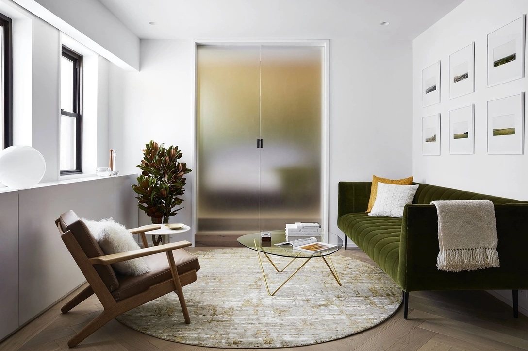 В своем брифе заказчики указали, что хотят смягчить «бетонные джунгли» центра Манхэттена и привнести в интерьер частичку природного ландшафта юго-запада Канады. Дизайнеры взяли за основу фотографию залитого солнцем Стэнли-парка и воспроизвели ее на стенах спальни. Они специально сделали раздвижные стеклянные двери — так фреску видно из гостиной, которая также оформлена в зеленых и золотых тонах.