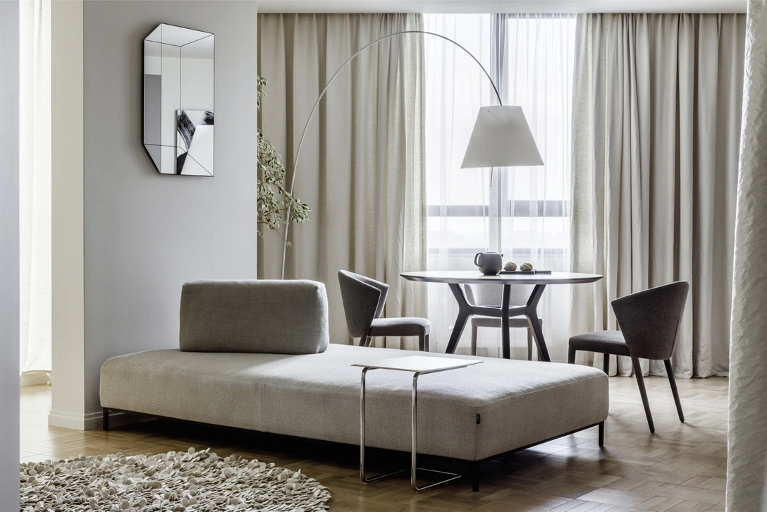 Стены в помещениях выстроены под углом, что отчасти было задано планом жилья. «Чтобы смягчить асимметрию, я использовал мелкий модуль паркета в шахматной раскладке. Геометрия стен стала выглядеть правильно, а объем помещений визуально увеличился, — говорит дизайнер. — Еще один декораторский прием, который помог скрыть геометрию пространства, — штора, идущая из коридора до гостиной. При входе за ней расположилась просторная гардеробная, а драпировка в гостиной создает ощущение, что квартира имеет продолжение. Фактура, цвет и плотность ткани Dedar отлично решили поставленную задачу — в интерьере она выглядит роскошно и неповторимо».