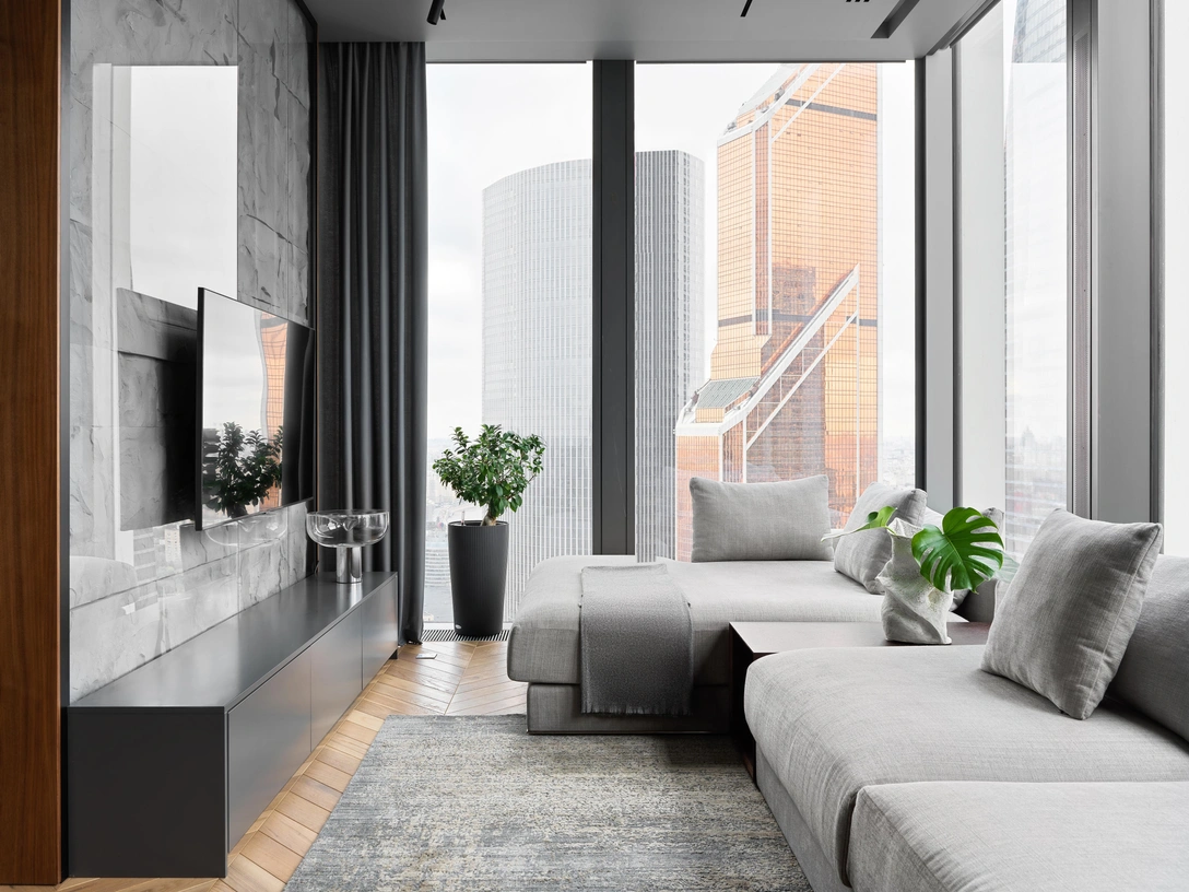 «Главное достоинство пространства — панорамные угловые окна. Именно из-за них мы поменяли изначальную планировку и перенесли гостиную в спальню. Так как это апартаменты, вопросы с согласованием удалось решить довольно легко».