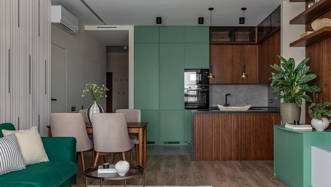 Цветовая гамма: фоновые цвета — молочные, акцентные — зеленые, синие, голубые