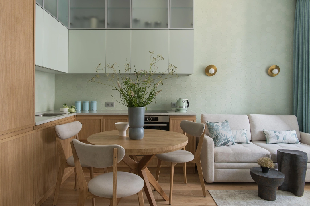 «Квартира небольшая, поэтому мы не стали дробить ее на части, а, наоборот, постарались сделать интерьер максимально целостным, — рассказывают авторы проекта. — Цветовая гамма строится на сочетании оттенков мяты и натурального дерева, которые переходят из одного помещения в другое. Также на объединение пространства „работают“ повторяющиеся элементы отделки. Например, фартук на кухне является продолжением орнамента за диваном в гостиной».