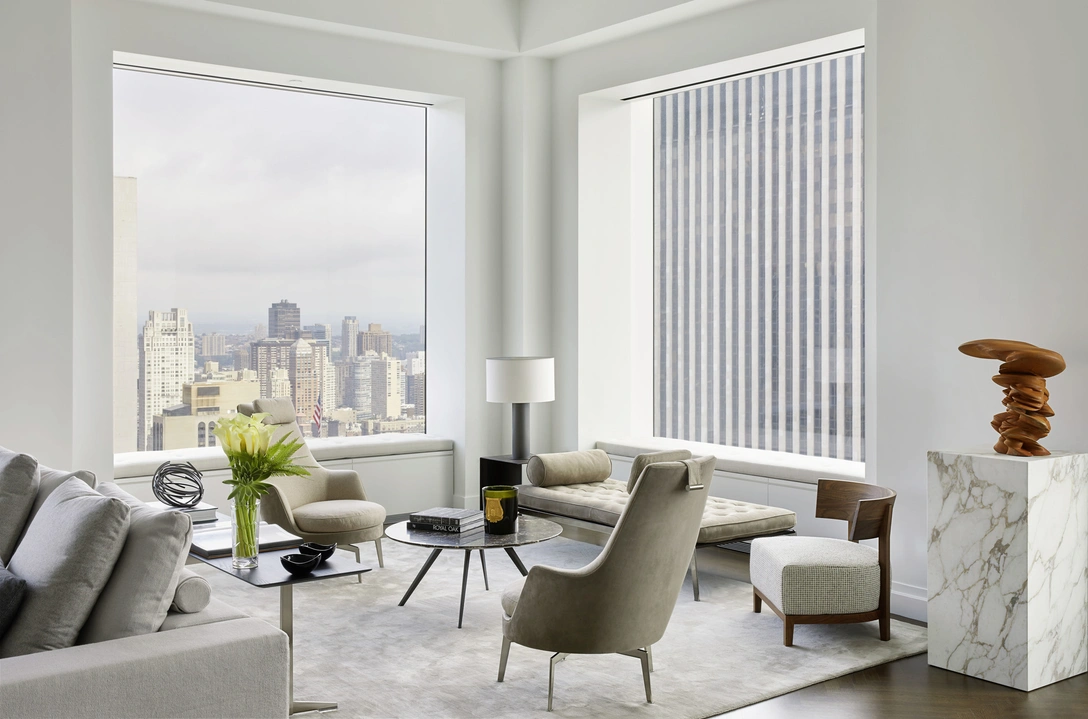 «Выбирая мебель, важно было смягчить галерейный аскетизм этого пространства и добавить уюта, — говорит дизайнер. — Мы поняли, что это под силу только итальянским брендам, и остановились на работах Антонио Читтерио (Antonio Citterio), сдержанный и элегантный стиль которого идеально подошел». Обивочные ткани помогли создать нужную атмосферу — мягкие и приятные на ощупь, нежных оттенков экрю и пудрового, они создают эффект кокона. Изголовье кровати обтянуто кожей, на полу — ковры с шелковым ворсом, сотканные в Непале на заказ. От ярких оттенков отказались, чтобы произведения искусства оставались на первом месте, но нашли для них изящное оформление. «Единственный, кто может соперничать с искусством в этой квартире, — Нью-Йорк, без всяких церемоний заглядывающий в окна, — говорят дизайнеры. — И ему тут очень рады!»