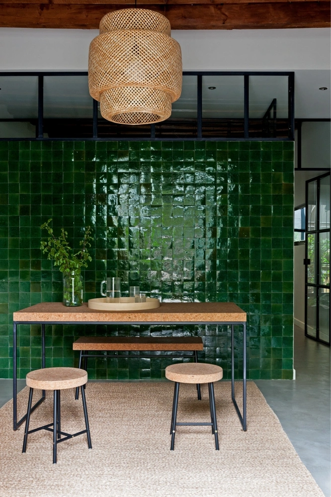 В интерьерах Илзе всегда масса функциональных деталей — каждую комнату хочется разобрать на детали и рассмотреть чуть ли не под микроскопом. Для Кроуфорд важны тактильность и теплота — в отделке преобладает дерево и натуральный мрамор. Вход фланкирует пышная зелень комнатных растений. И сразу за ним — стена, эффектно выложенная изумрудной марокканской плиткой, формованной вручную. Это главный декоративный акцент.
