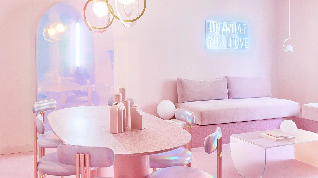 Интерьер почти полностью выполнен в розовых тонах: только на фасадах кухни можно найти оттенки синего и золотого. «Таким образом мы хотели заставить гостей выйти из зоны комфорта и начать мечтать. Розовый — это цвет нового поколения, которое борется за свое счастье и находит свой собственный путь, слушая сердце и интуицию», — объясняет дизайнер Патрисия Бустос (Patricia Bustos).