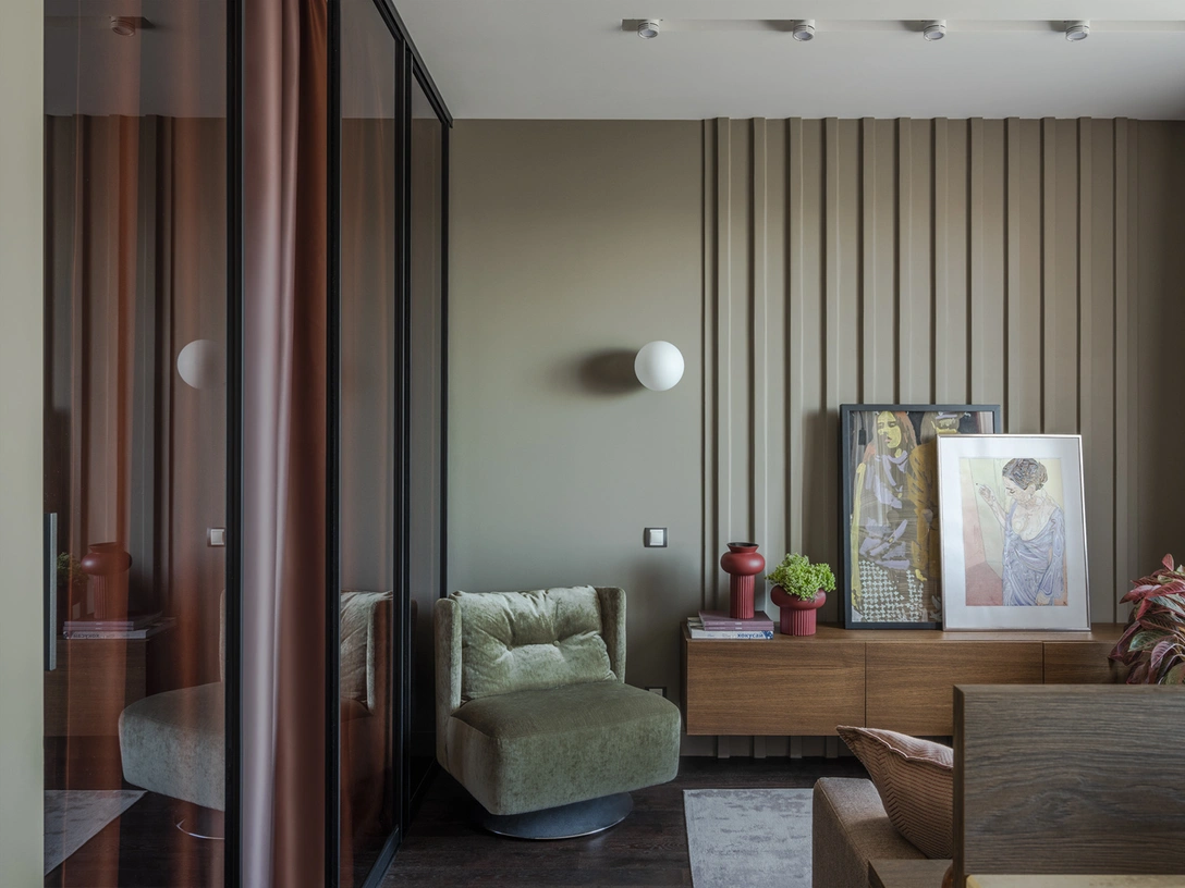 Для стен подобрали сложный оттенок: в зависимости от освещения он переходит из коричневого в хаки. А в качестве объединяющих пространство цветов выбрали розовый и винный — они связывают спальню и кухню-гостиную.