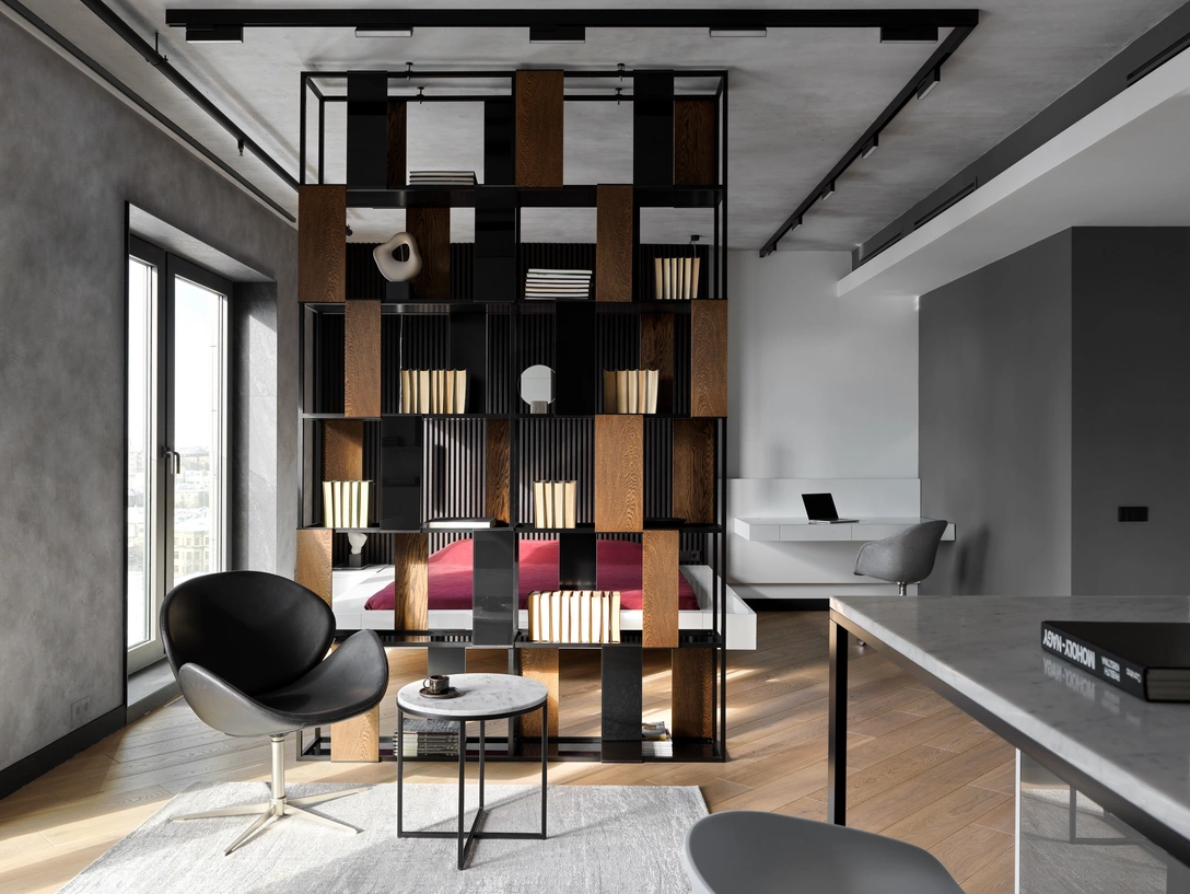 В основном помещении находятся кухня, гостиная и спальня. Оно не имеет перегородок, за исключением стеллажа между гостиной и спальней. Архитектурные приемы объединяют пространство в целую композицию. В цветовом силуэте объема кухни прослеживается форма, отражающаяся в разных частях интерьера. Все элементы мебели независимы друг от друга и самодостаточны. Композиционные объемы стен с декоративными панелями и рейками расположены симметрично, но при этом создают цветовой контраст, обусловленный функциональным назначением зон интерьера.