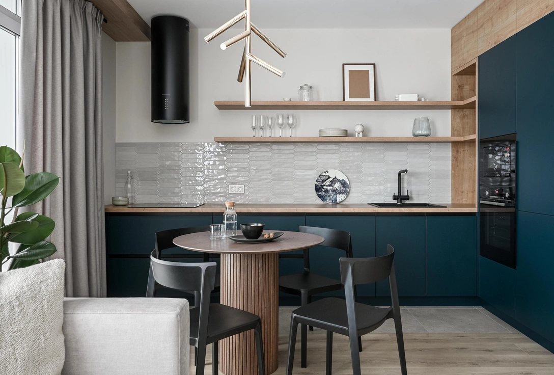 Похожий прием мы использовали в прихожей. Одну стену мы целиком выкрасили в глубокий синий оттенок, а на второй сделали цветную отбивку. Благодаря этому решению прихожая кажется не такой узкой, какой является на самом деле.