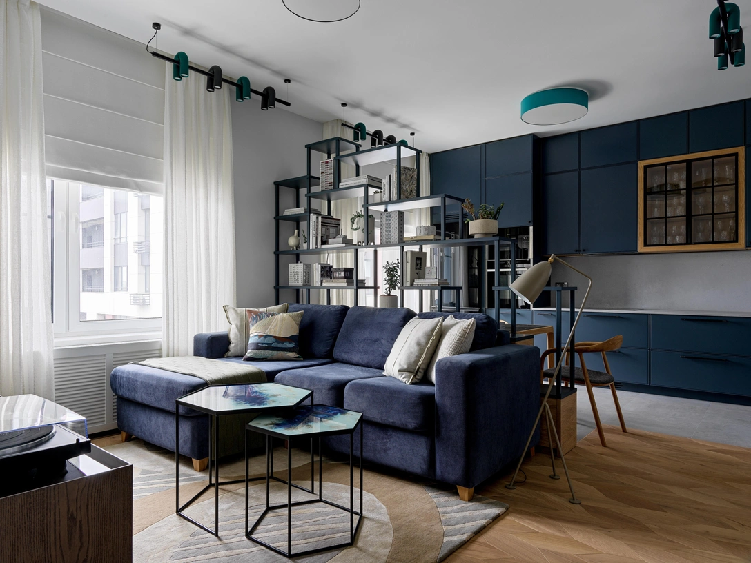 «Гостиная и кухня разграничены специально спроектированным стеллажом, на котором выставлены растения и предметы из коллекции хозяев. Этот предмет мебели был одним из первых пожеланий хозяев. На полках можно разглядеть интересные модели советских зданий — жилых домов, киоска и даже электростанции. Но больше всего стеллаж понравился коту. Он первым делом забрался на самый верх и начал раскачивать трековую систему, а потом стал осваивать нижние полки».