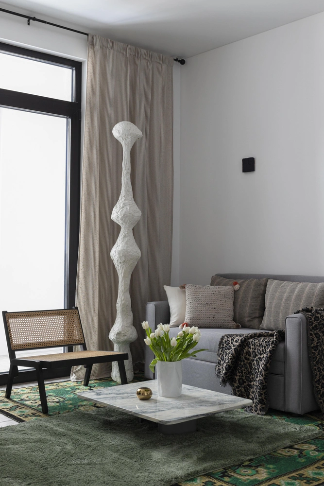 Гостиная получилась довольно просторной. И здесь есть дополнительное спальное место — раскладной диван. Рядом с ним расположилось кресло с плетеными вставками и низкий столик, выполненный из натурального камня, а на полу лежит ковер 1950-х годов, принадлежавший моей бабушке.