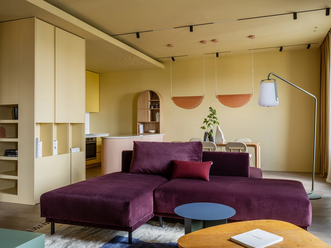 «Чтобы не создавать неуправляемое цветное безумие, мы выбрали несколько оттенков, которые повторяются из помещения в помещение, связывая всю квартиру воедино. После этого в каждой комнате появились акценты, создающие разное настроение. Также мы принесли из прошлого проекта идею с „персональным солнцем“. В той квартире мы выкрасили балкон в желтый цвет, чтобы наполнить все пространство теплым светом. В этом проекте желтым стал „буфер“ между двумя зонами. Таким образом „солнце“ поселилось в самом сердце дома».